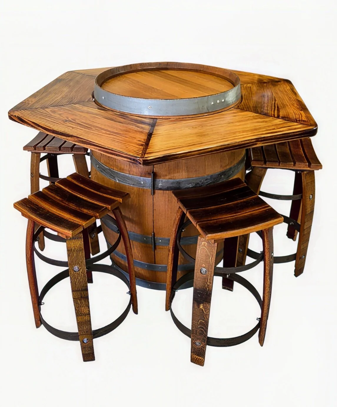 1.2 metre wide solid Tasmanian Oak top with a flame-aged finish to create a rustic, premium look that complements the barrel and stools.